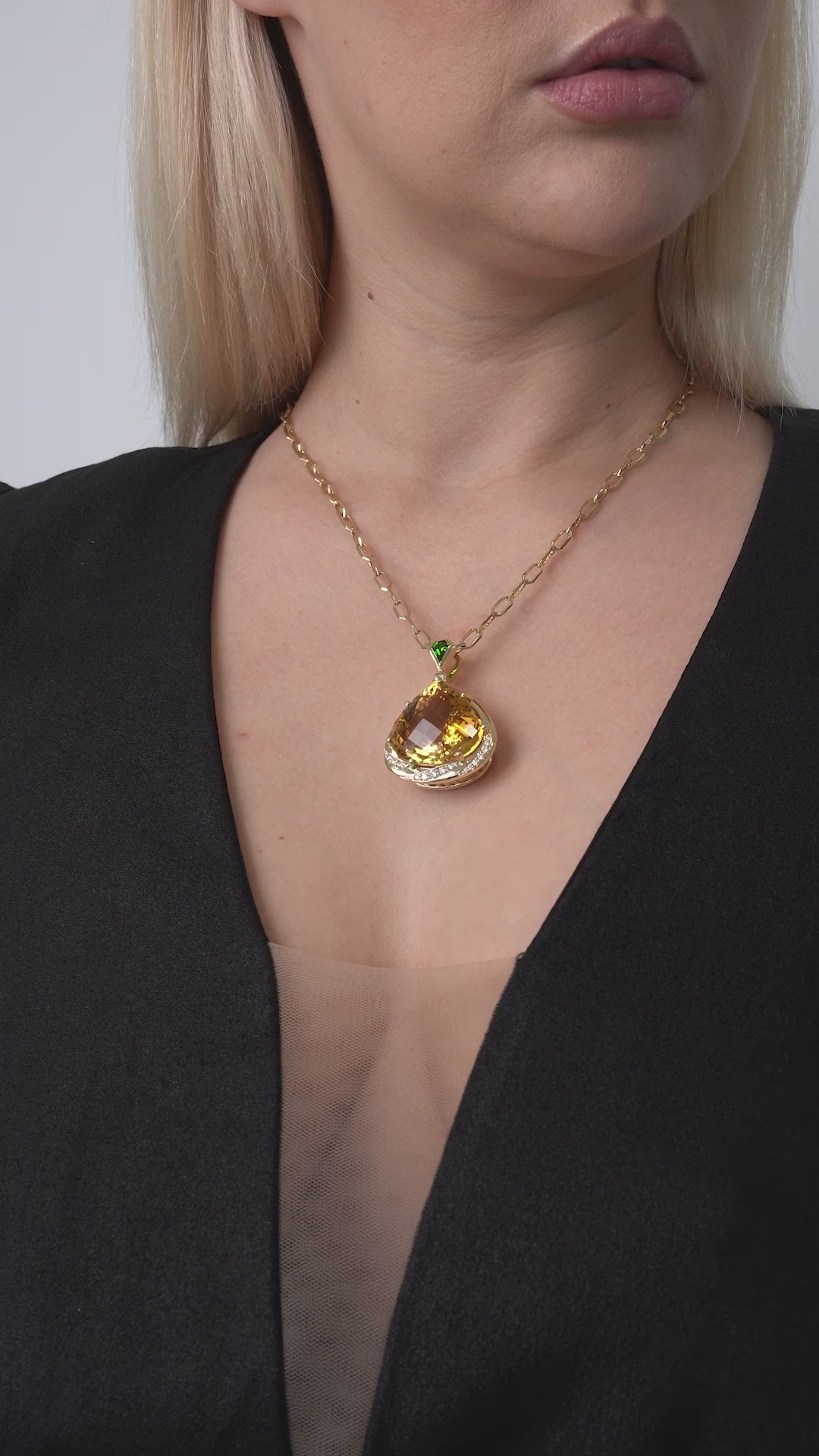 Where the heavens meet artistry, Caleums Jewelry presents the Celestial Radiance Pendant, a harmonious blend of ethereal beauty and exquisite craftsmanship. This captivating piece features a mesmerizing golden-yellow gemstone, reminiscent of the sun's radiant glow, set in a bed of diamonds that sparkle like distant stars in the night sky. The striking contrast of the deep green gem at the bale evokes the lush vibrancy of the earth, connecting the celestial with the terrestrial in perfect harmony.
